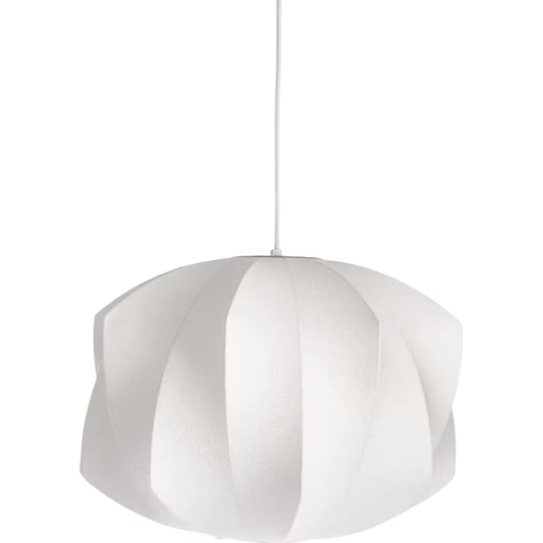 The Nelson Propeller Bubble Pendant (1952) has an angular, twisting pattern across its shade, adding dimension to its spherical form. Designed to float delicately overhead, this handcrafted hanging Bubble Light comes with nickel-plated mounting hardware. The Bubble Lamps were first designed in 1952 when Nelson was impressed by a set of Swedish hanging lamps. Their prohibitive price prompted Nelson to design his own in a way that made them more affordable. The result was a series of lamps with elemental, spherical shapes like a rounded apple, an elongated cigar, and a shapely pear, among others.