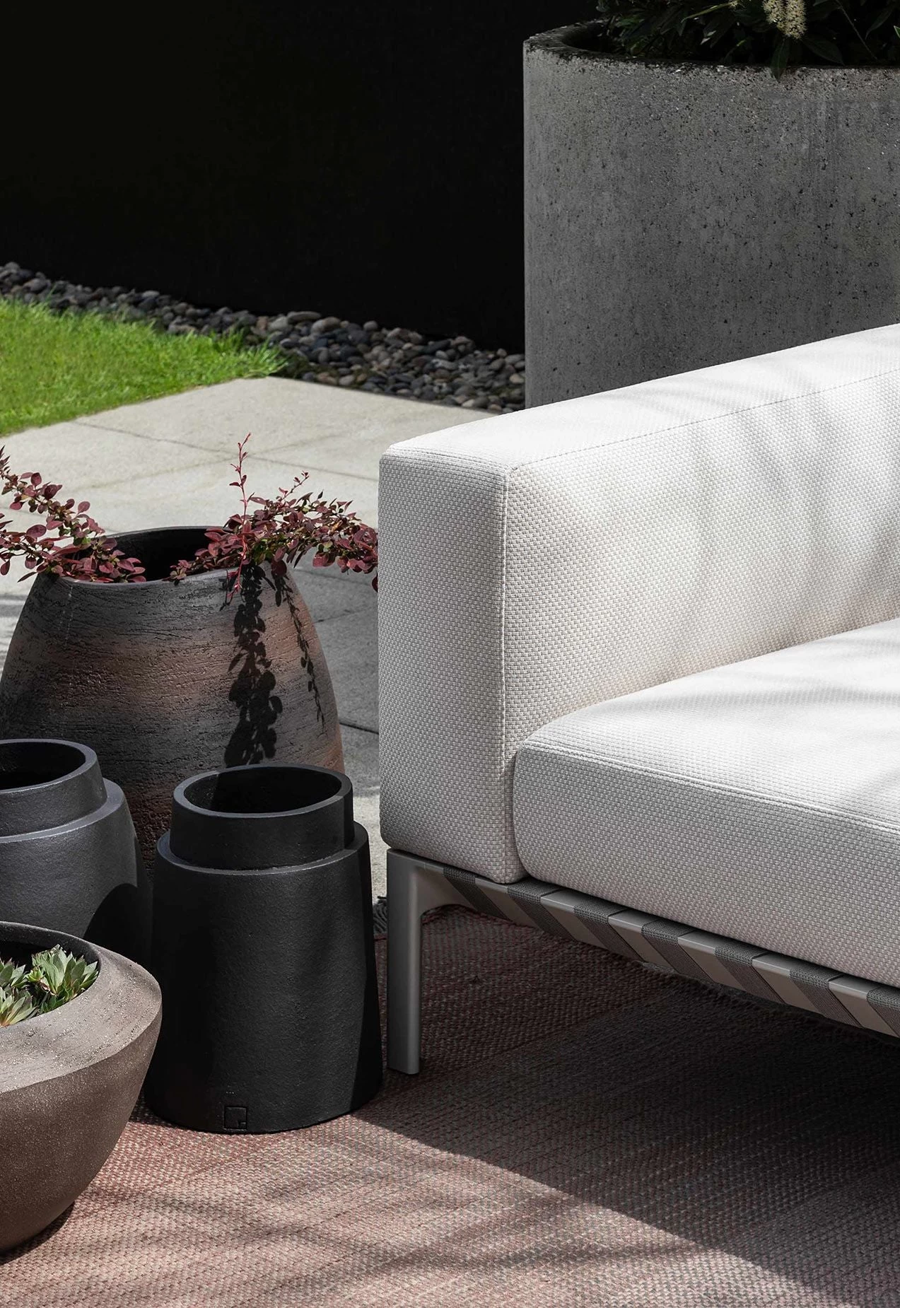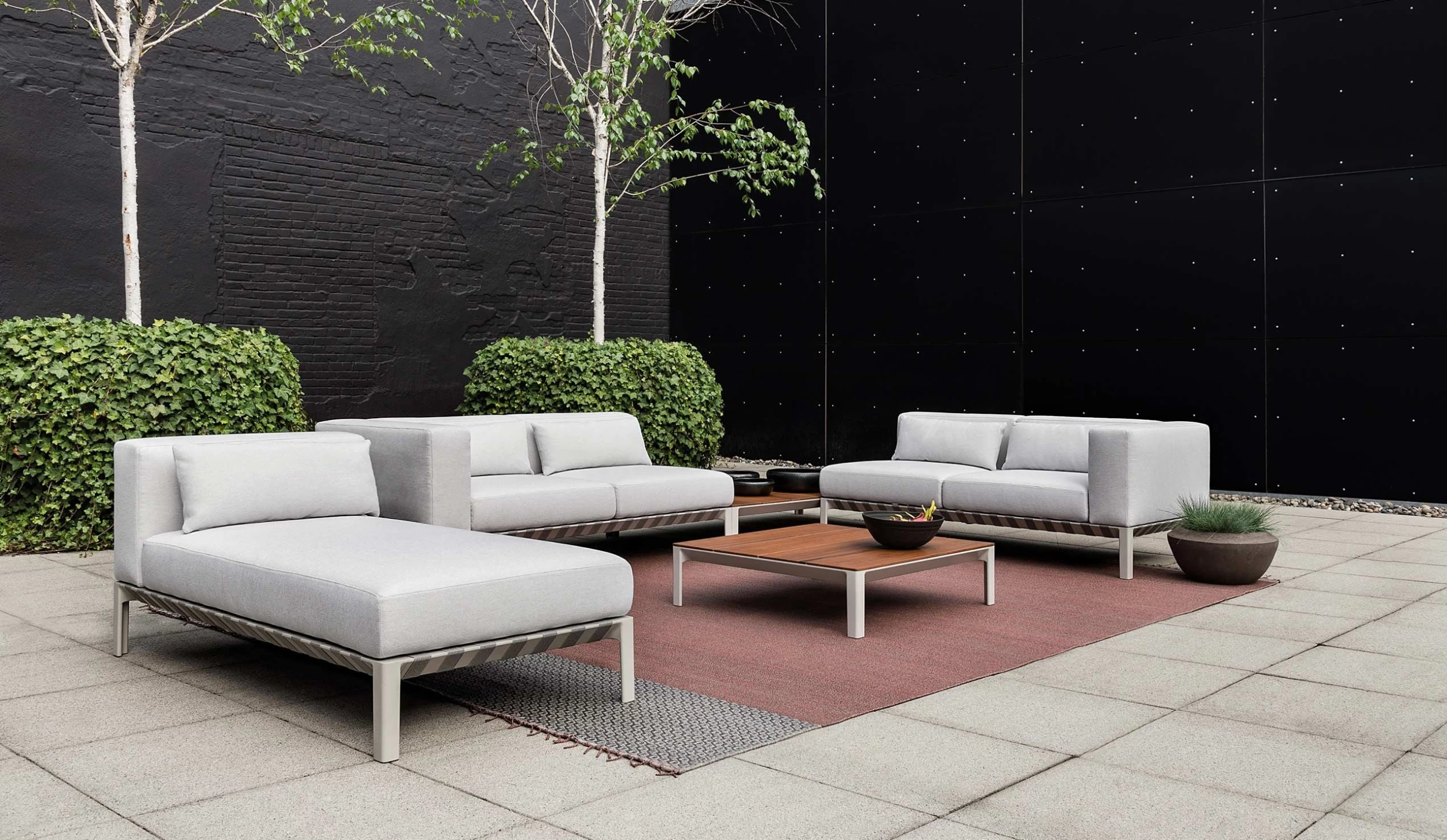 The Able outdoor collection is characterized by an expansive array of configurations and excellent craftsmanship. The generous shapely upholstery ensures comfort and achieves visual lightness supported by the woven bands that wrap the slender orthogonal frame. Perfectly functional as individual furniture pieces the exterior series may be applied as sectional elements, reconfigured into unlimited unique compositions. Additional individual customization is possible with the curated fabric offering.
