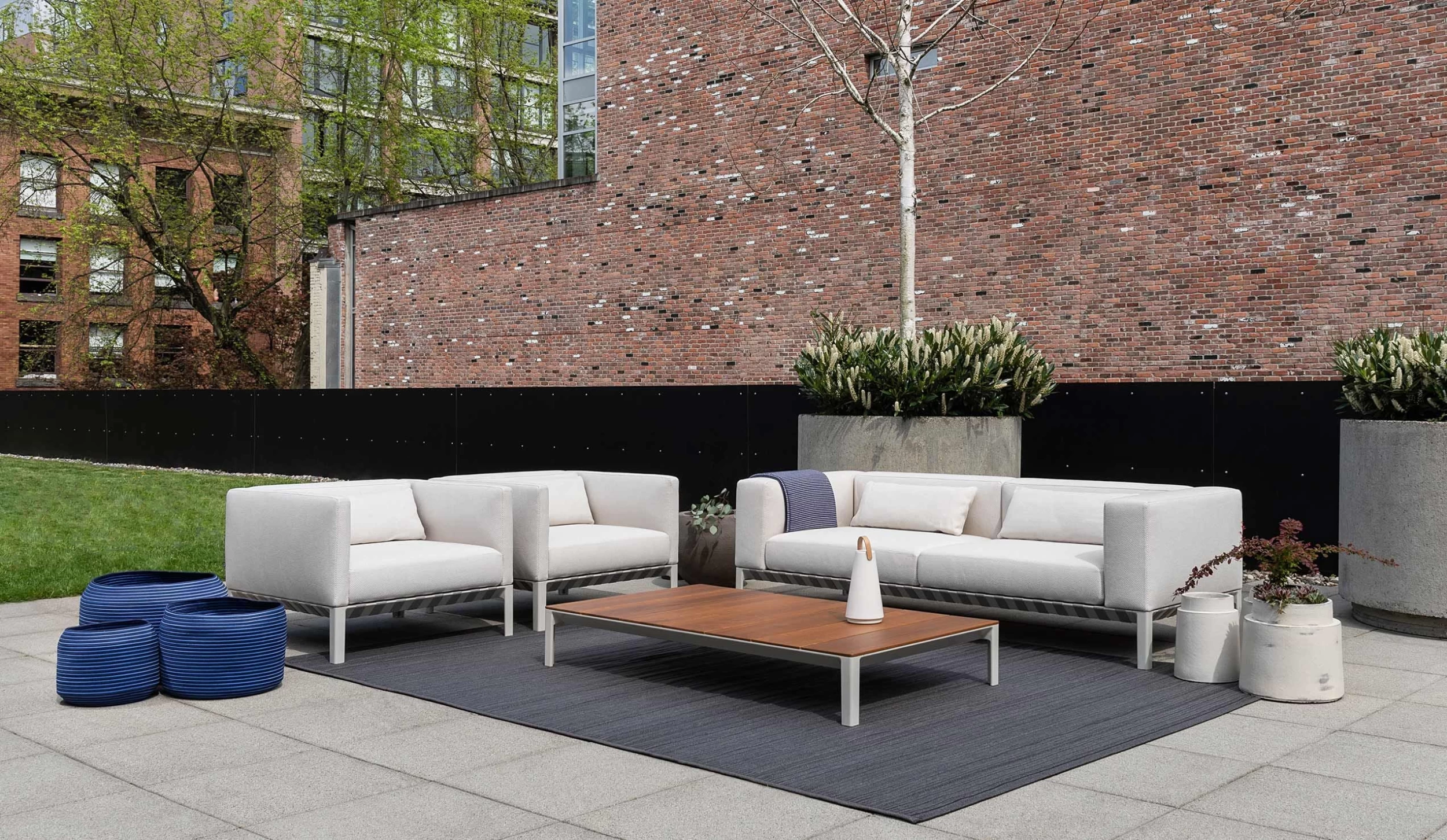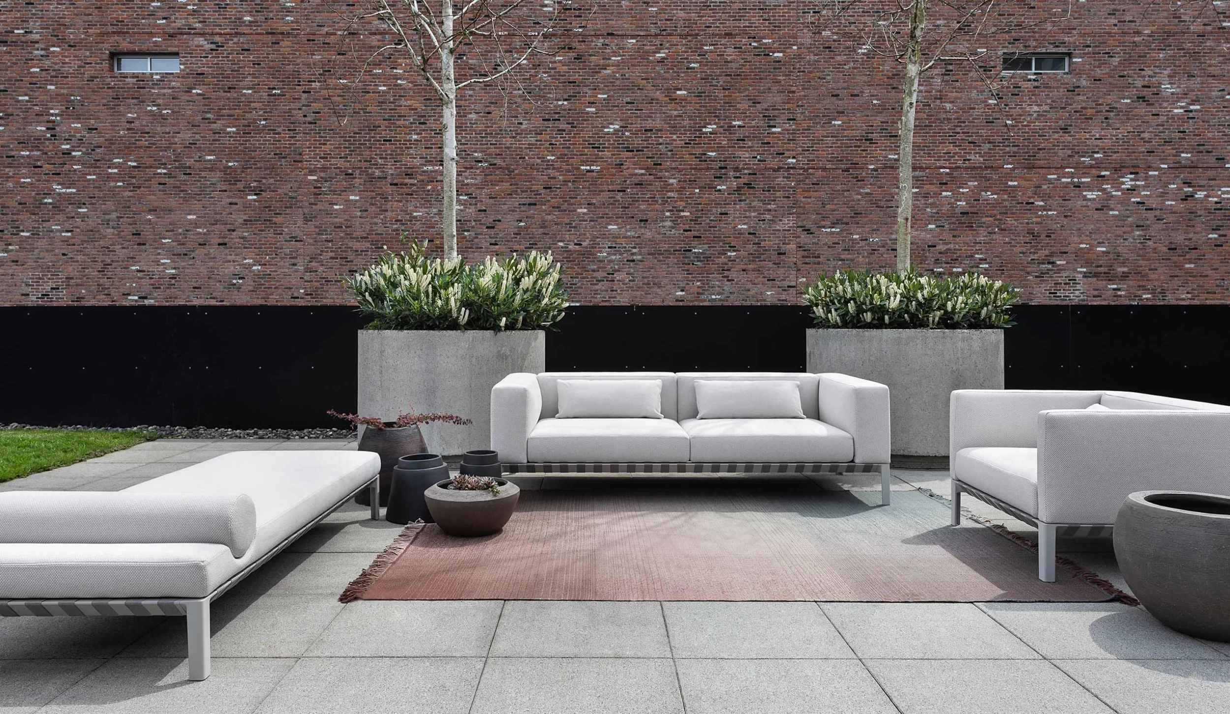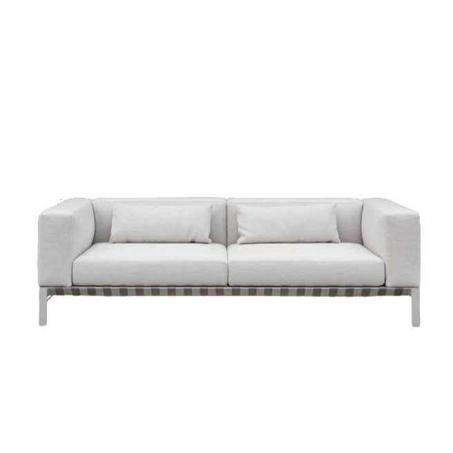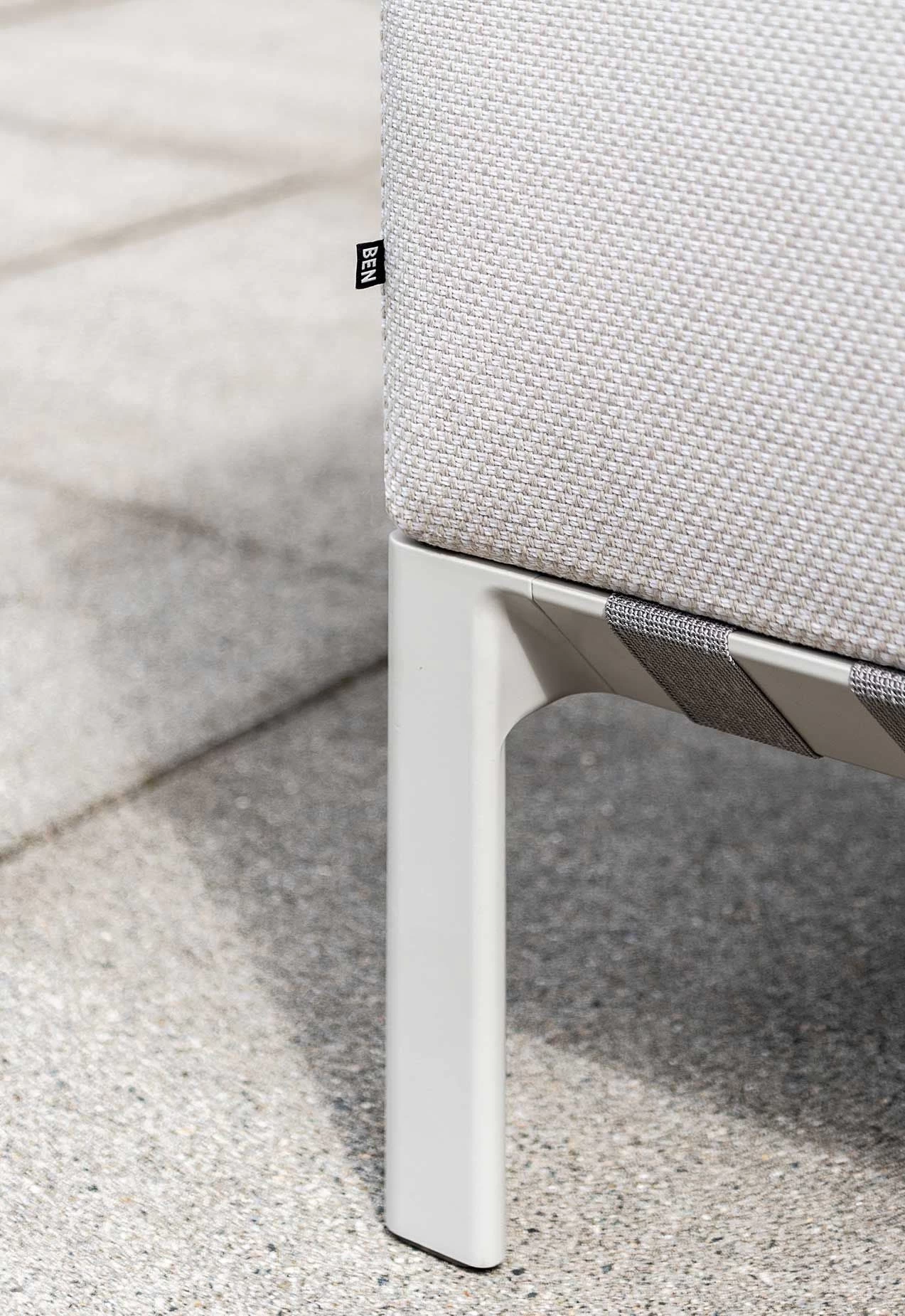 Outdoor sofa, with a powder coated die cast aluminum legs with aluminum extrusion rails and internal steel reinforcement bars. Base finish in Sand Grey. Waterproof undercover with sealed seams and breathable mesh. All covers are removable and washable. Fabrics are susceptible to sun cream and tanning oils after prolonged contact; clean all contact surfaces after use. After rainfall Bensen recommends cover removal for drying along with the cushion cores before use.