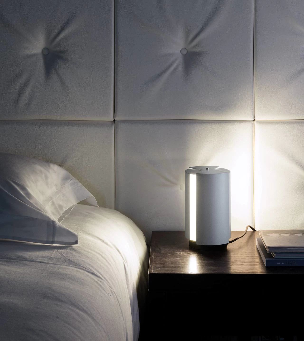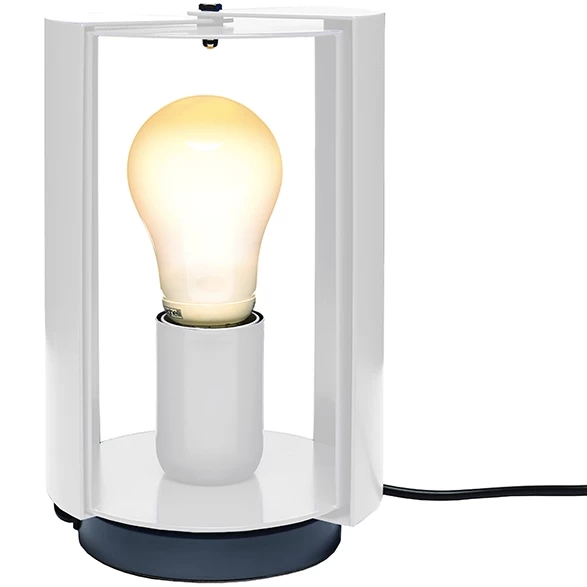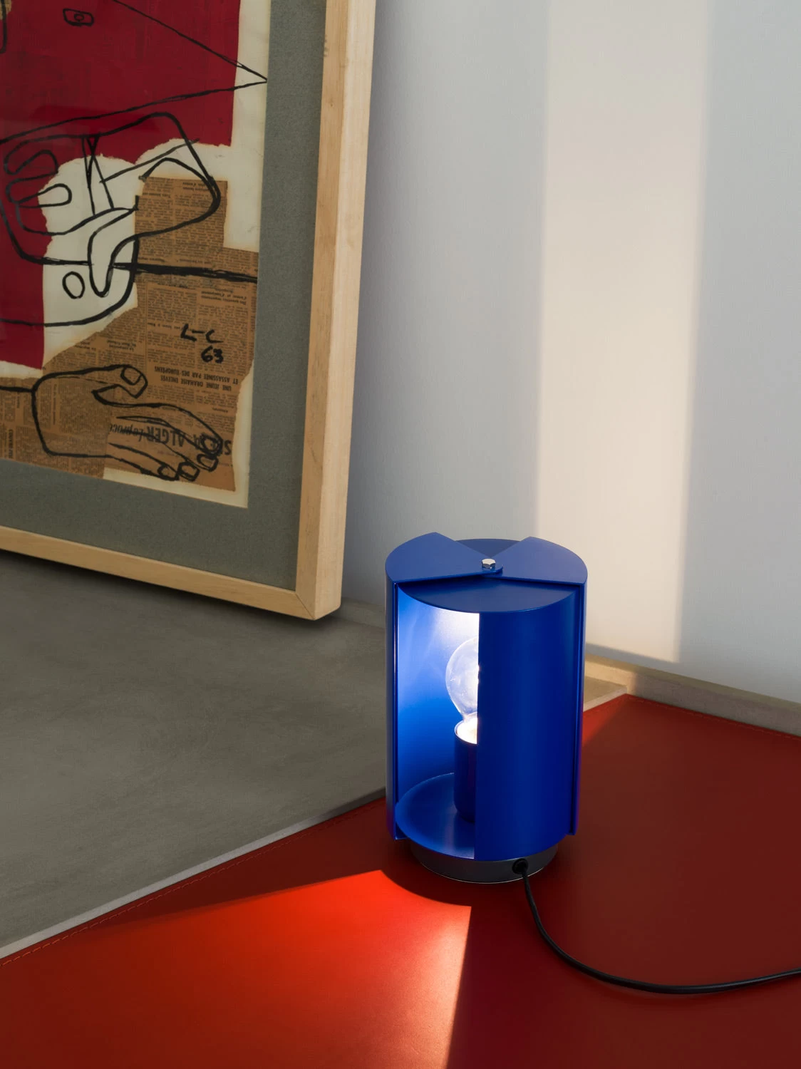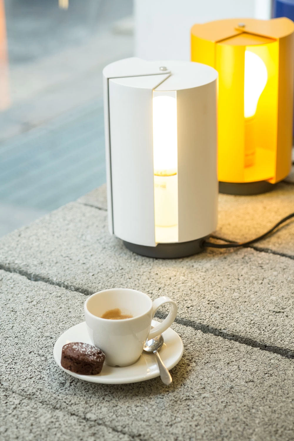 Innovative design for the 50s but still a contemporary table lamp. The lighting output is adjusted by the opening or closure of the volets. Its cylindrical body opens on two sides on which two diffusers rotate allowing the opening and closing of the light beam to adjust the light in a direct or indirect way.