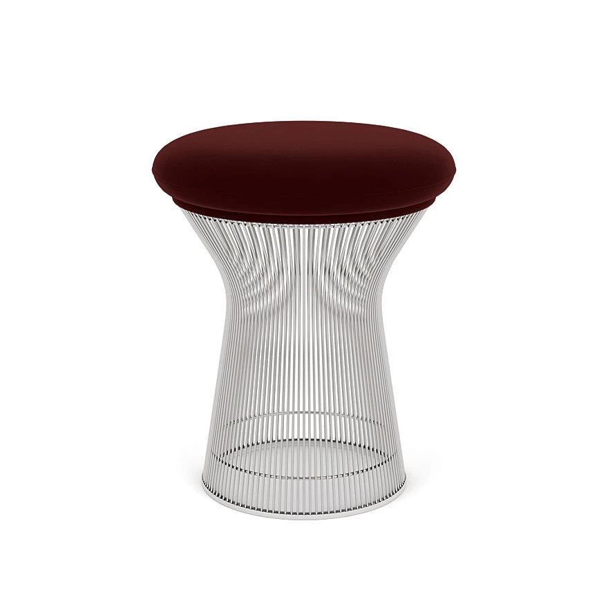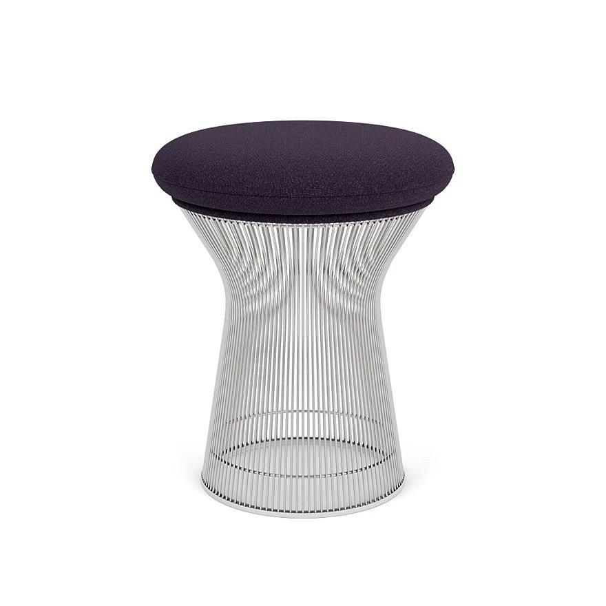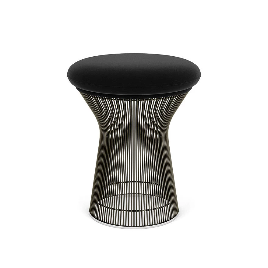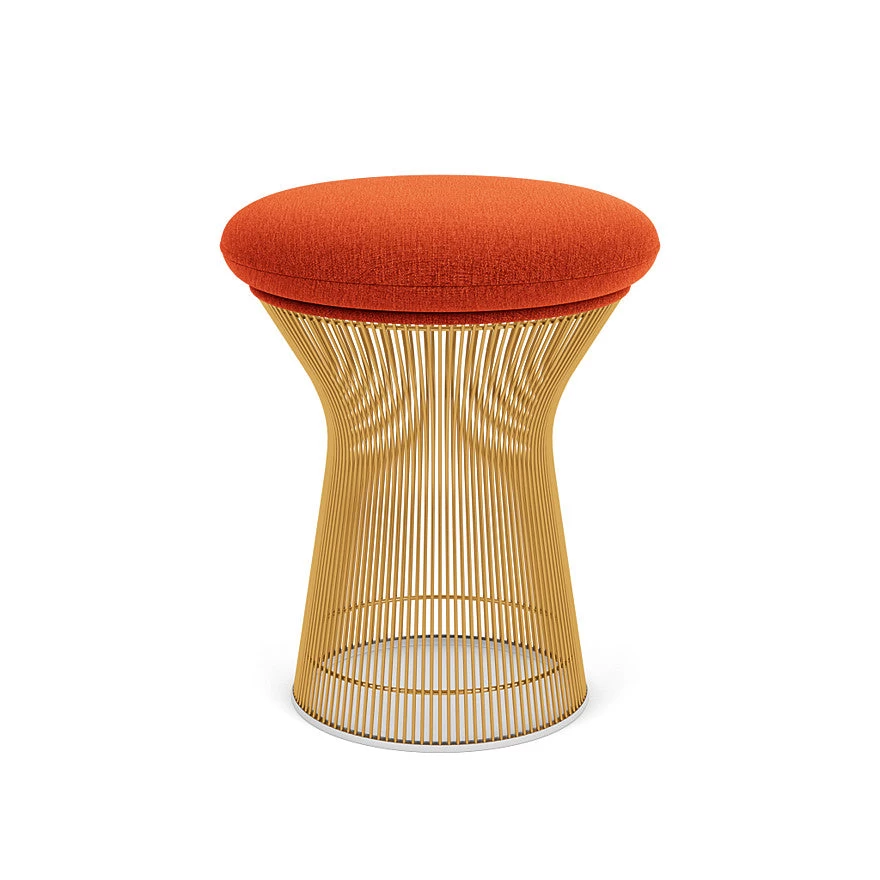 Stool with a moulded latex foam cushion in a choice of upholstery. The base is made of vertical steel rods welded to circular horizontal and edge-framing rods, finished in polished nickel, 18k gold plate or metallic bronze paint.