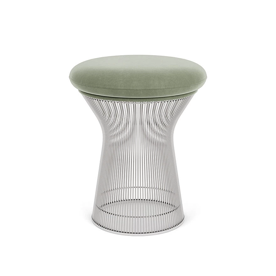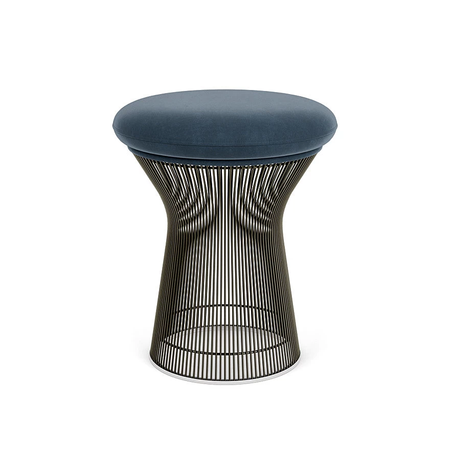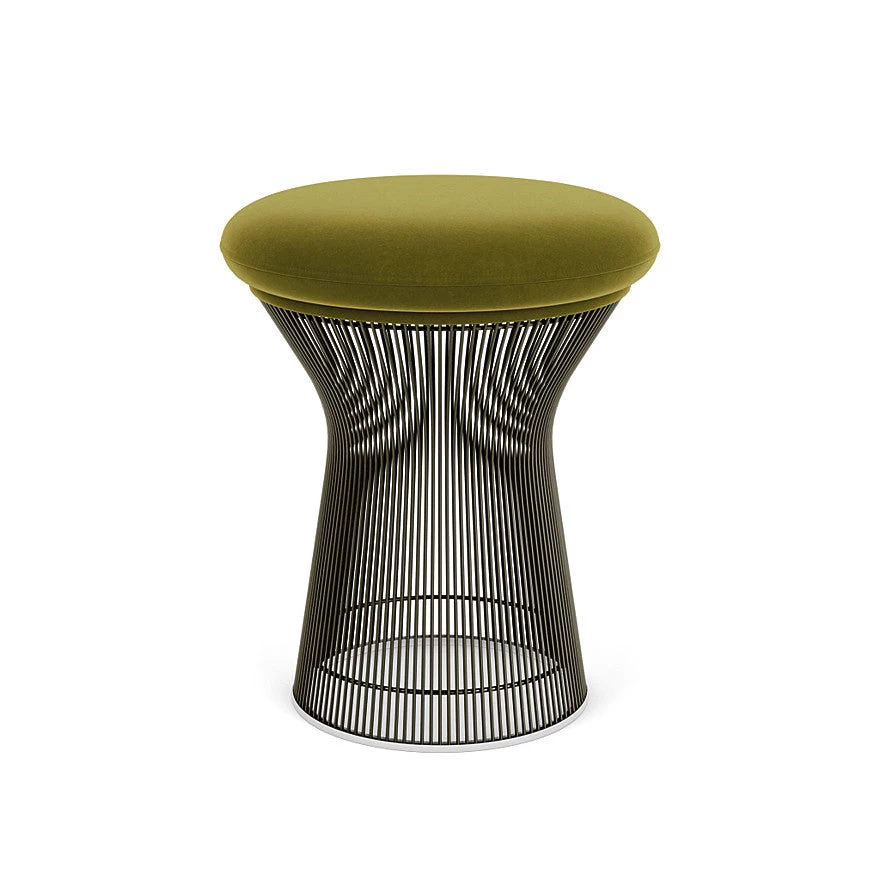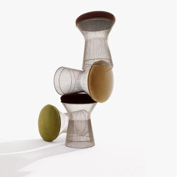 In 1966, the Platner Collection captured the “decorative, gentle, graceful” shapes that were beginning to infiltrate the modern vocabulary. The iconic stool is created by welding curved steel rods to circular frames, simultaneously serving as structure and ornament.