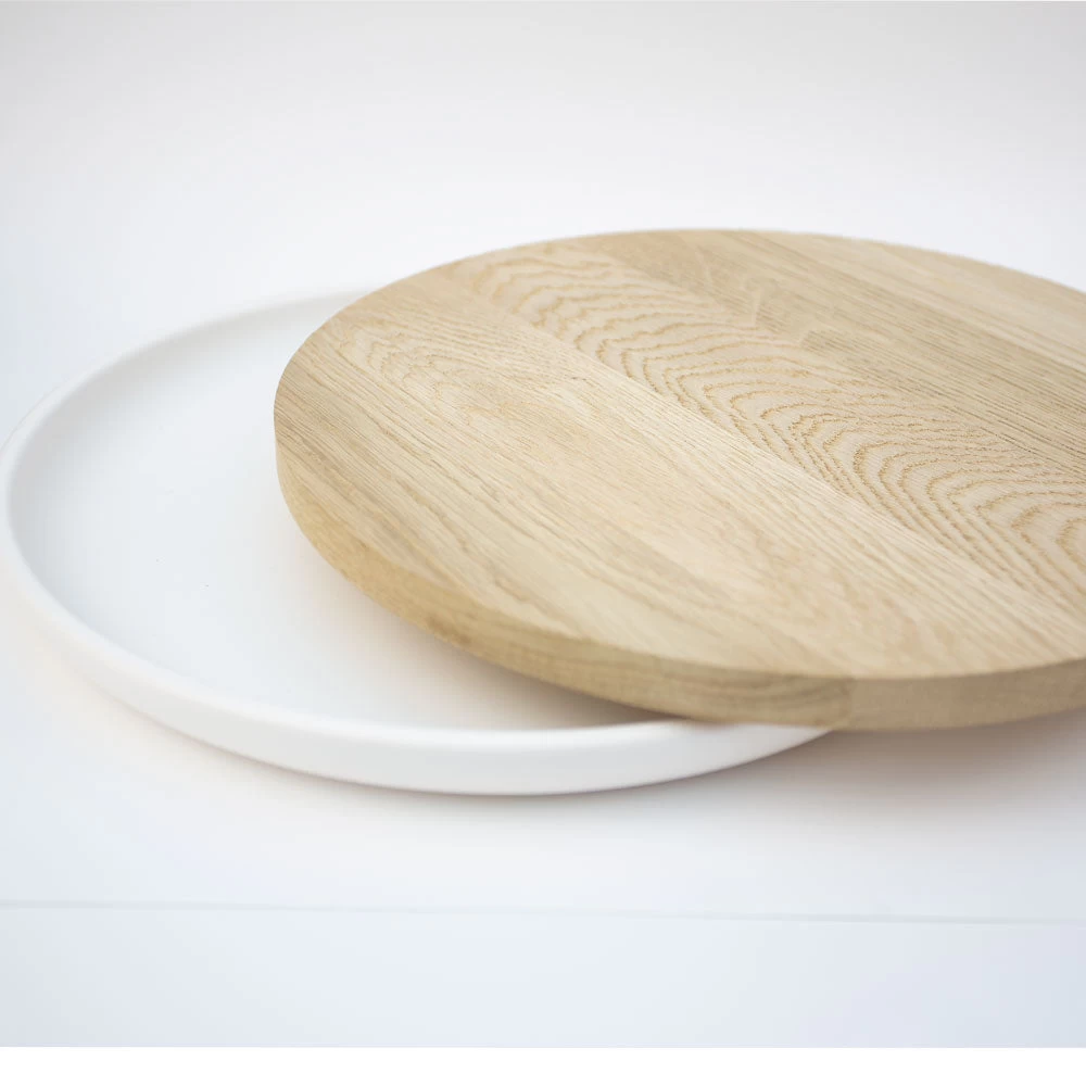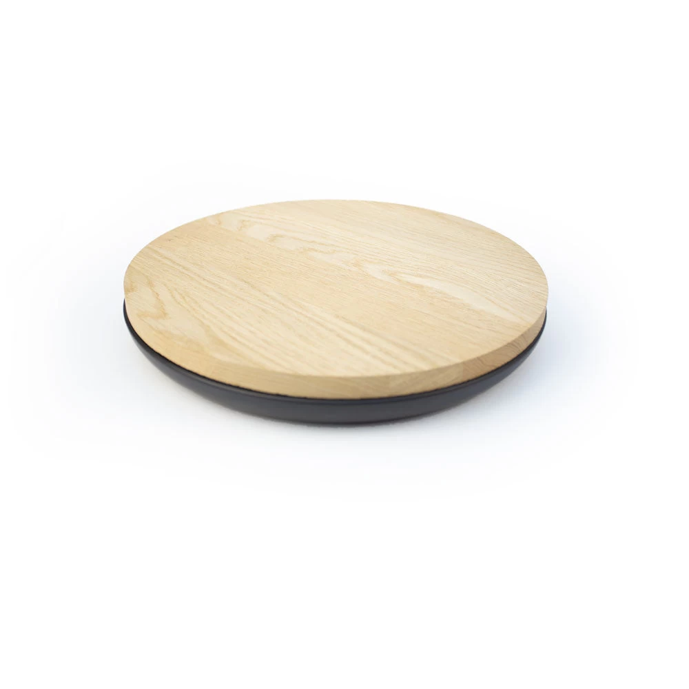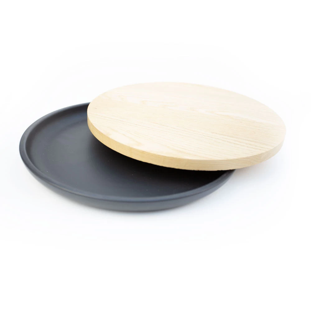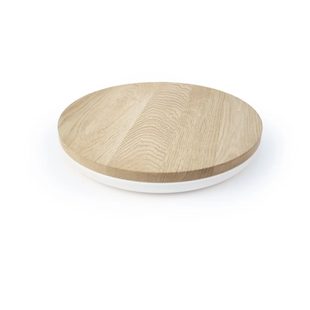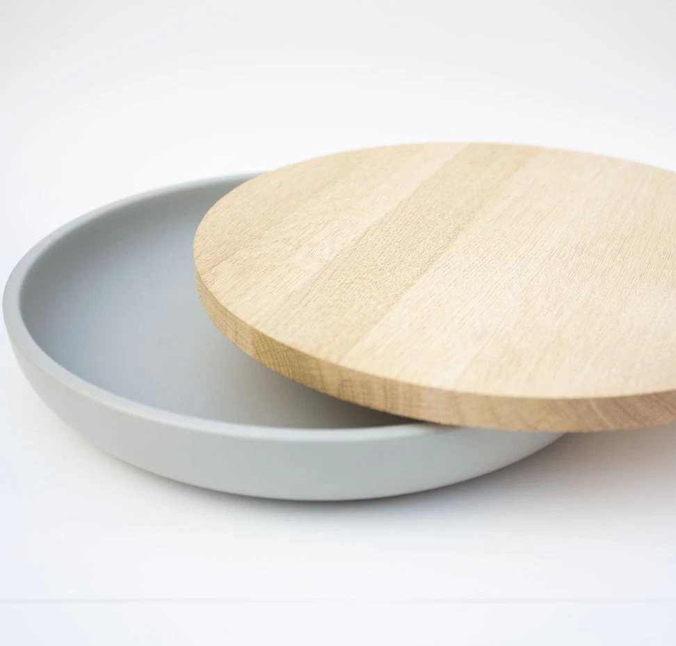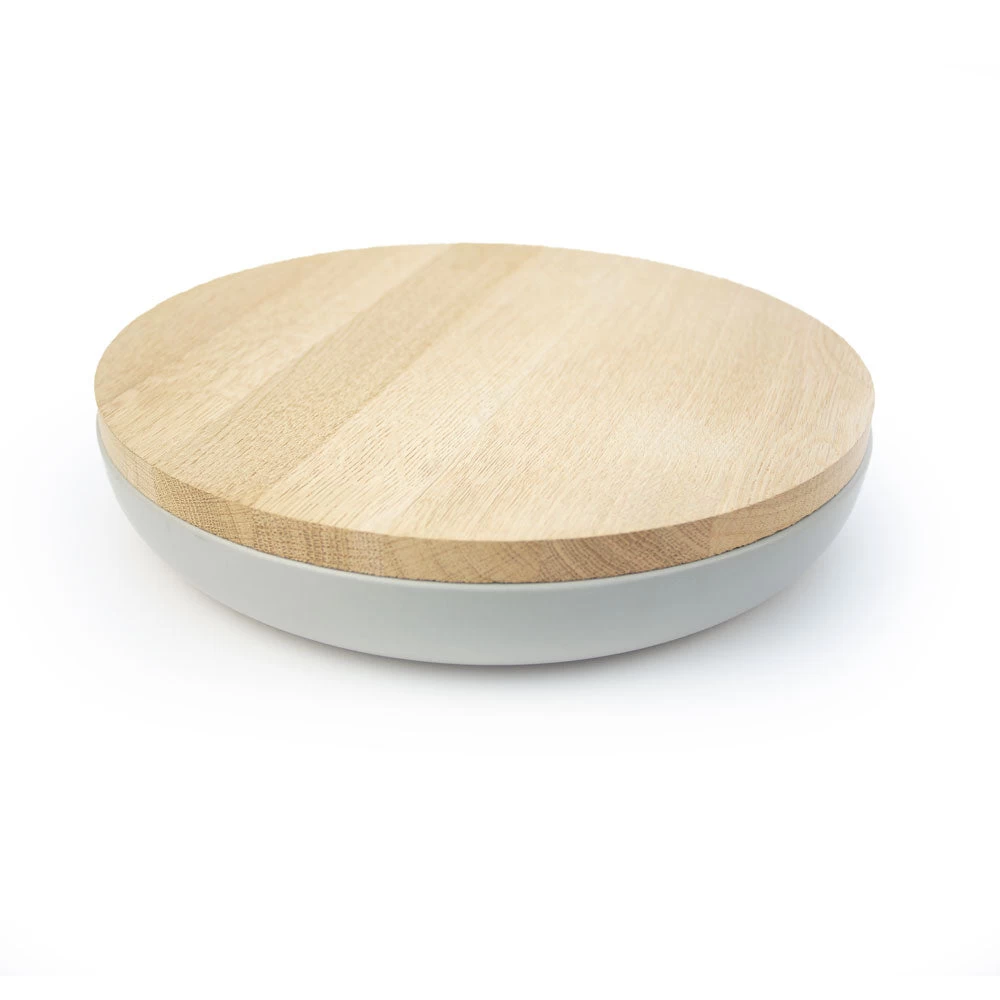 Ceramic bowl with a sandblasted oak lid in various sizes.