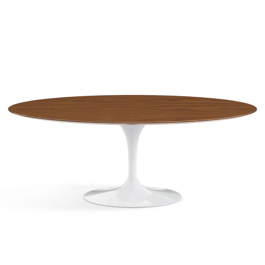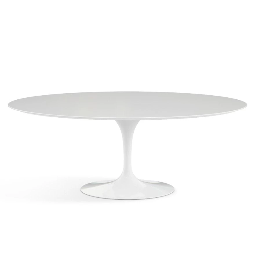 Dining table with a choice of top materials and a base in heavy moulded cast aluminum in white or black finish. The top attaches to the base with a threaded rod. The KnollStudio logo and signature of Eero Saarinen are stamped into the bottom of the base or underside of the tabletop.