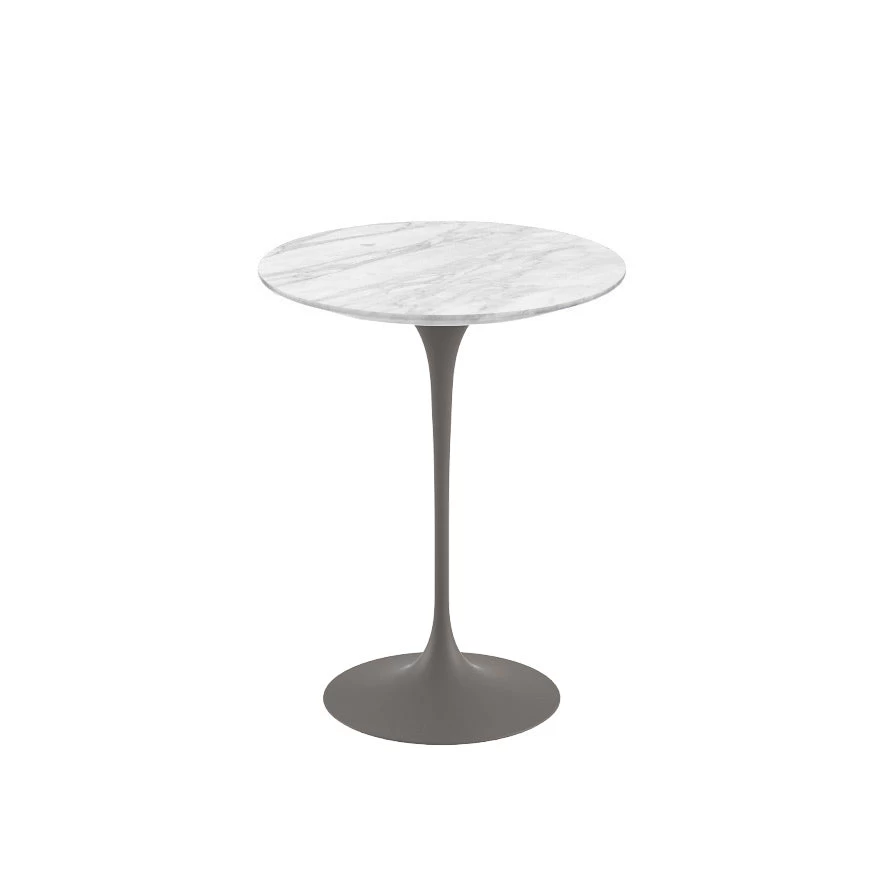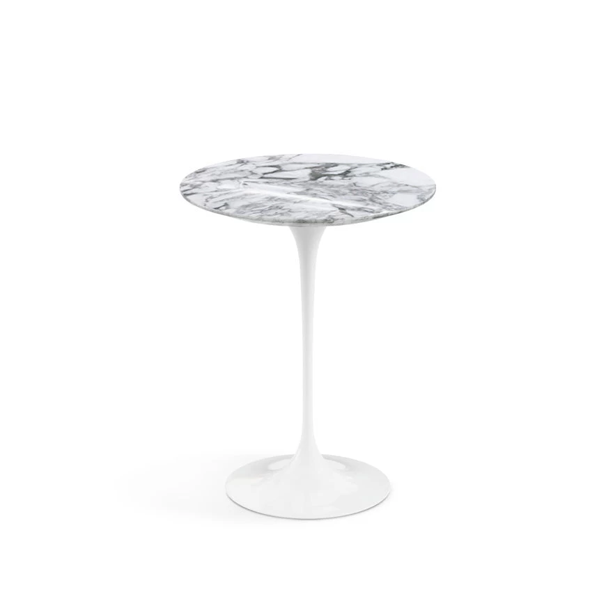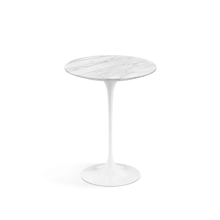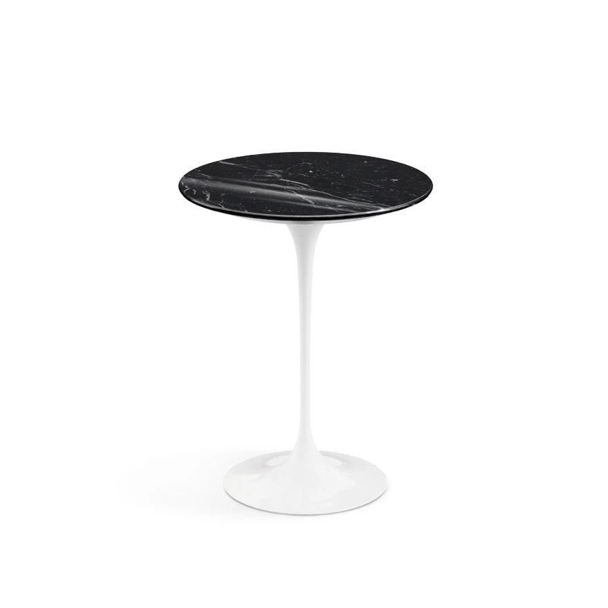 Side table with a choice of top materials and a base in heavy moulded cast aluminum in white or black finish. The top attaches to the base with a threaded rod. The KnollStudio logo and signature of Eero Saarinen are stamped into the bottom of the base or underside of the table top.