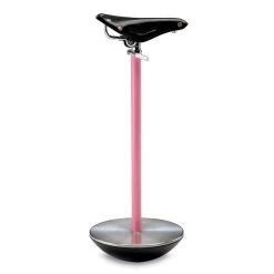 Stool with a pink lacquered steel frame, a cast iron base and a seat made of a black saddle of a racing bicycle.