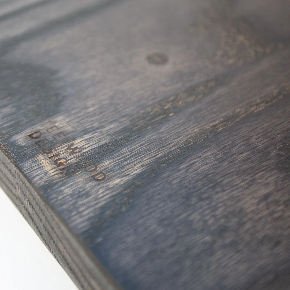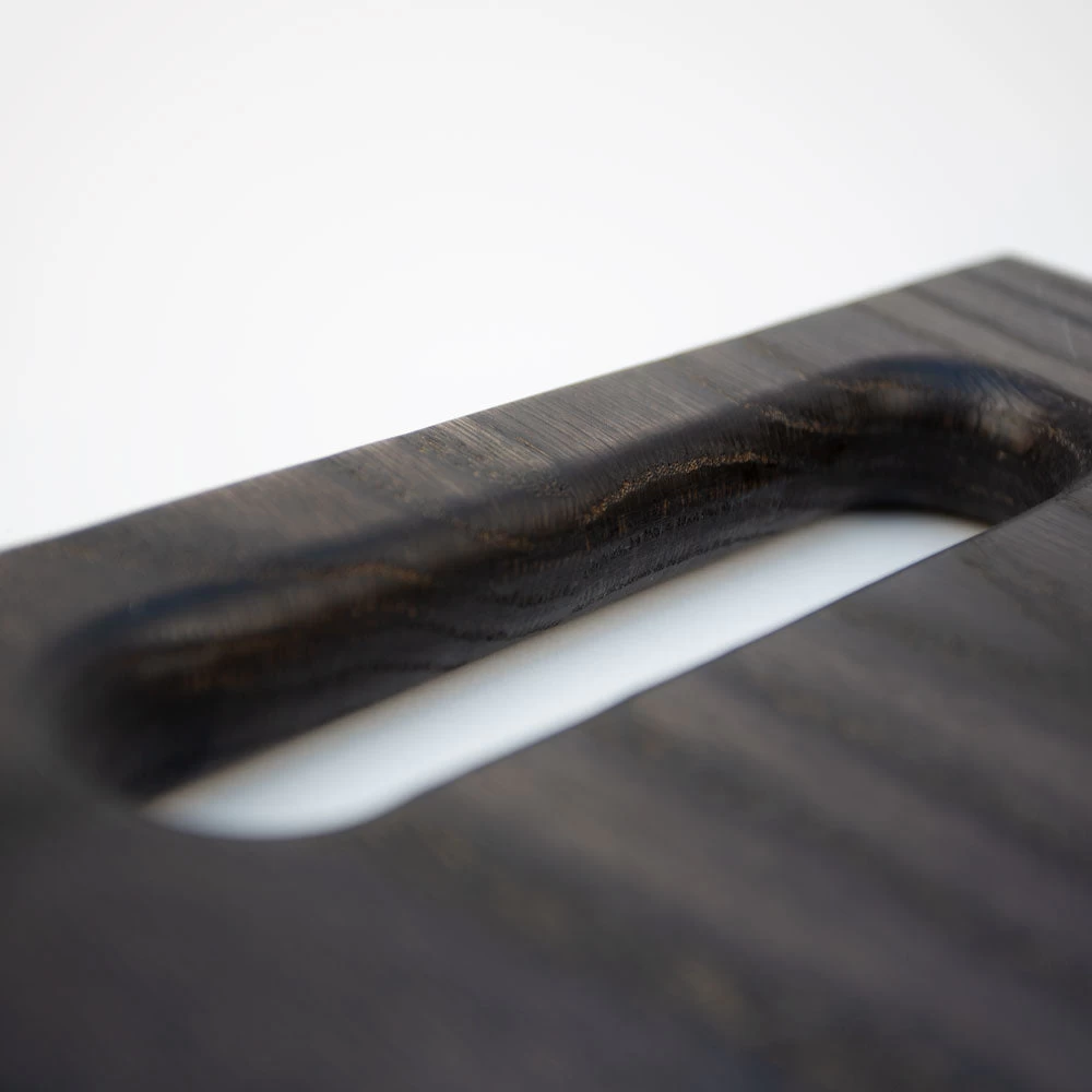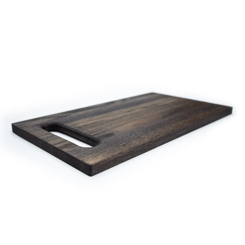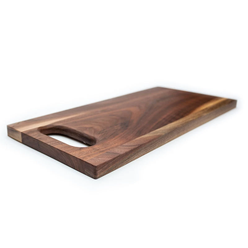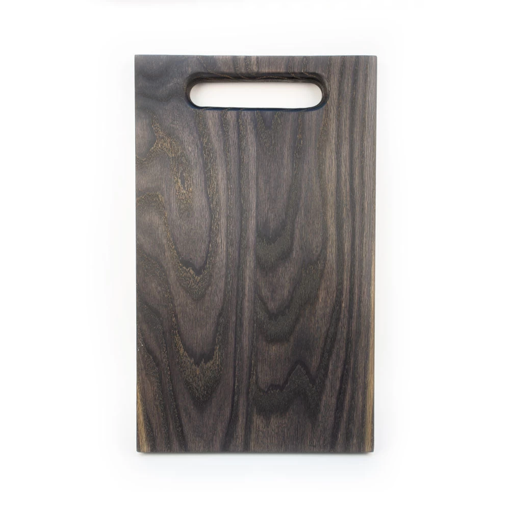 Hand-made cutting board in a variety of wood finishes, with a small logo on the back.