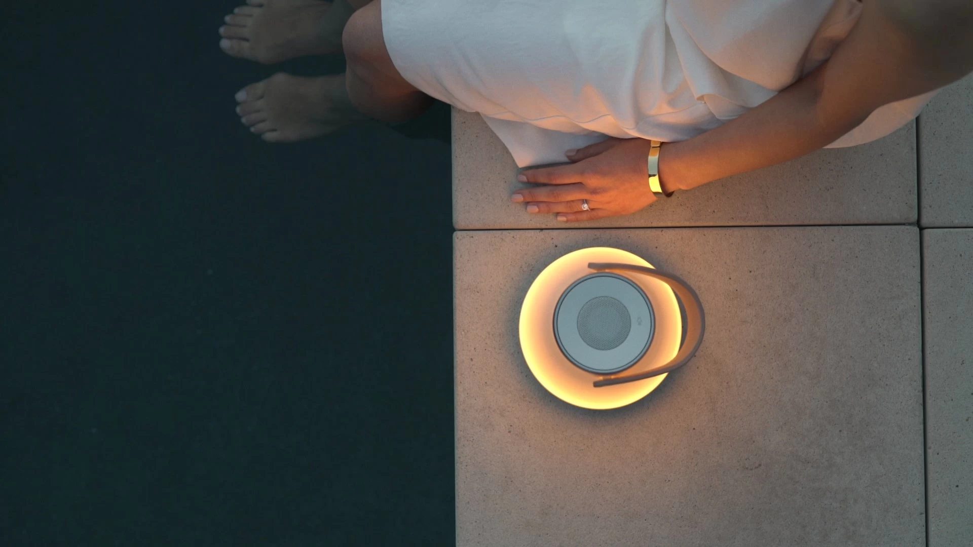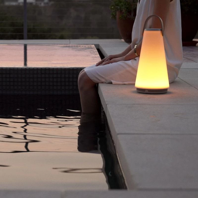 Polycarbonate and steel portable light with a leather strap. Features warm dimming technology, Bluetooth connectivity and an optional surface mount. Full range dim control. Rich 360° sound. 97% recyclable.Â