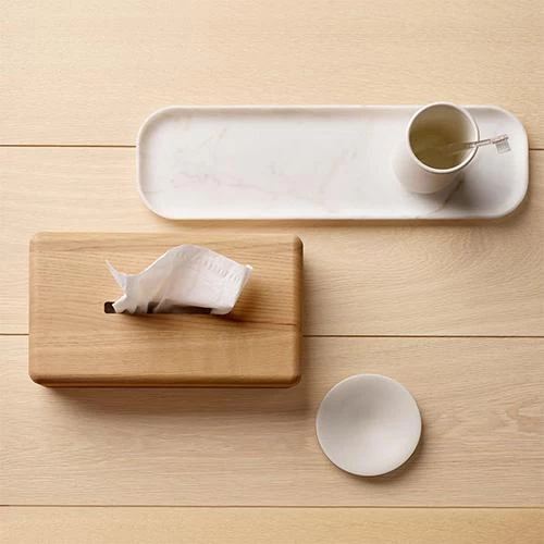 Designed by Vincent van Duysen for When Objects Work, the Bathroom Collection is a sculptural and serene set of ceramic stoneware or marble containers neatly displayed on a tray. The Tissue Box is available in oak wood.Â