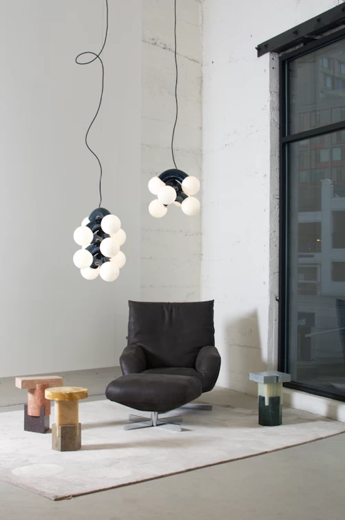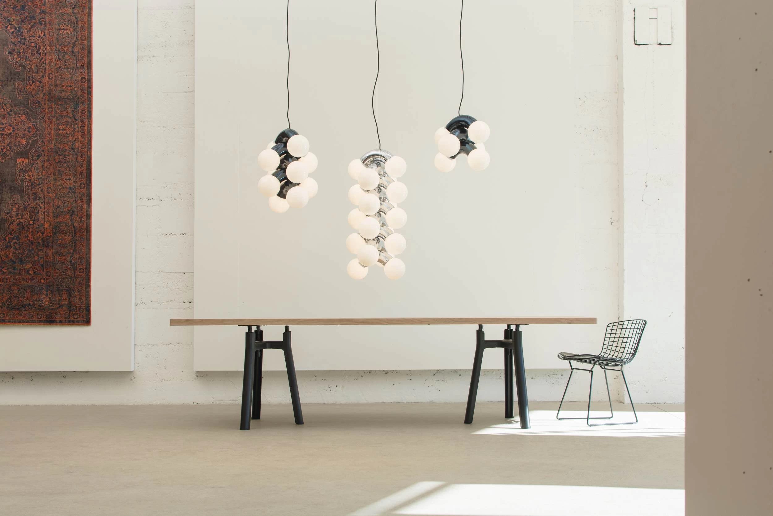 The Vine series introduces exaggerated form with a propensity for repetition resulting in a bold impact. Composed of a poised chrome arc flanked by two glowing glass globes—the multiplication of the module enables the fixture to grow, exponentially overstating the fixture’s overall silhouette.