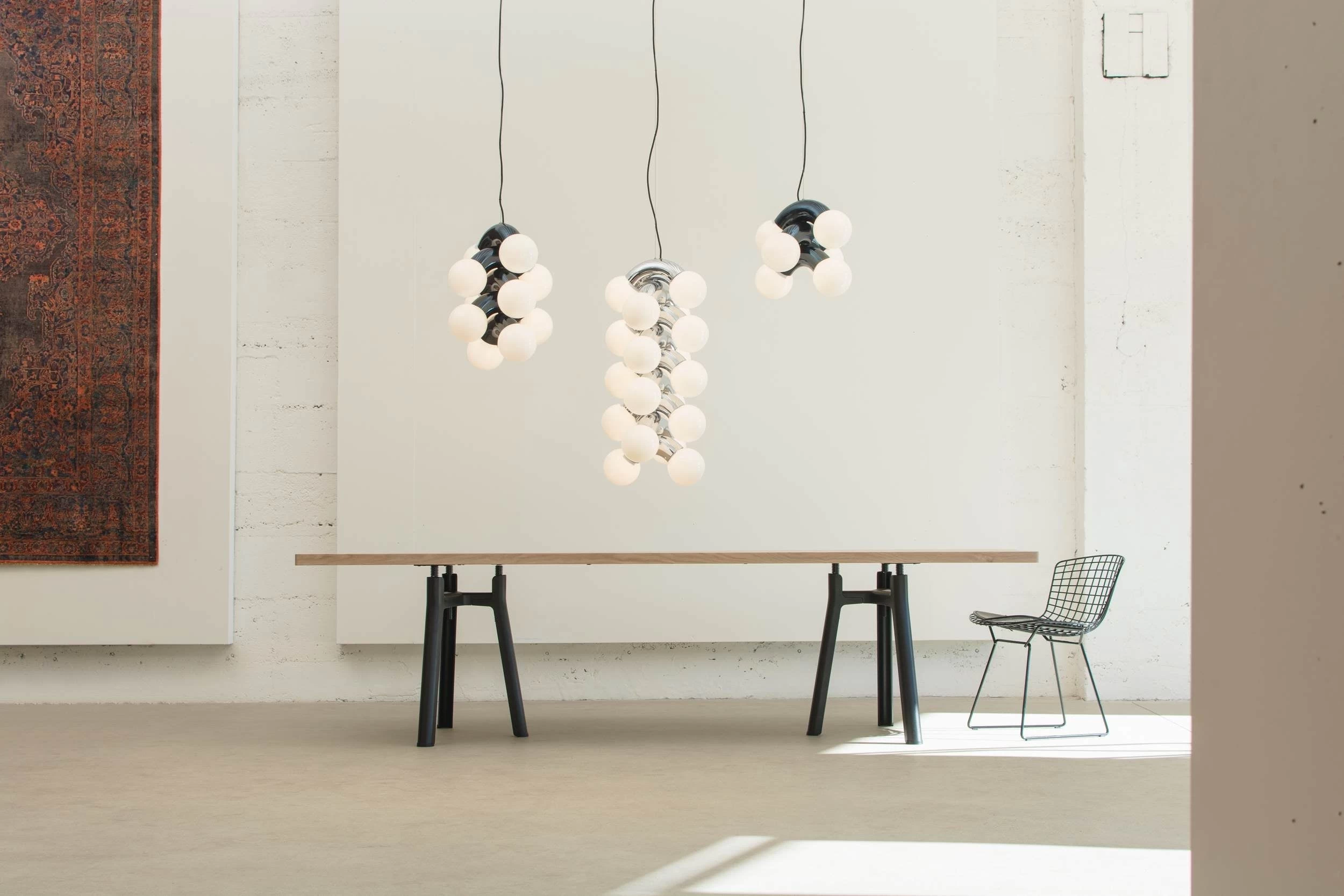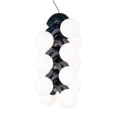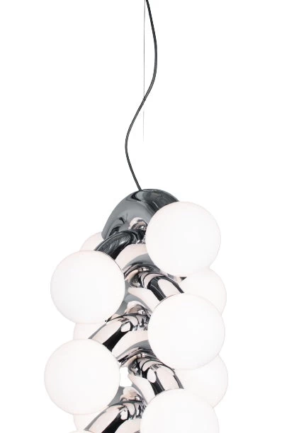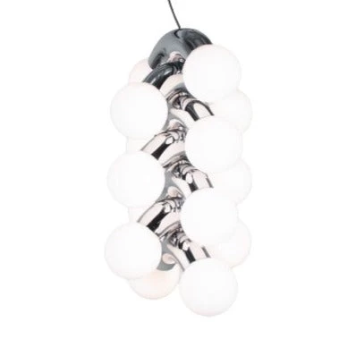 Pendant light with a steel frame and opal glass globes. Available in chrome or midnight chrome finish. 110–120V.